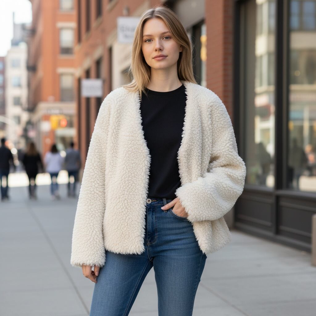 ノーカラーデザインでカーディガンのように軽く羽織れるデザインのボアコートです。シンプルながら存在感を放つ素材がスタイリングをリッチに魅せてくれます。