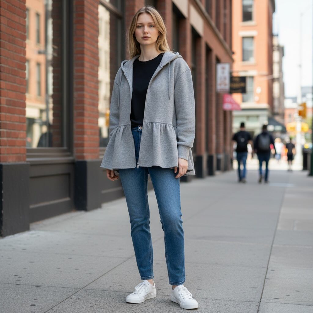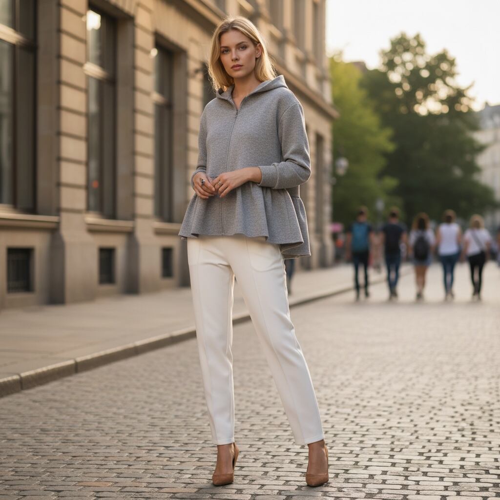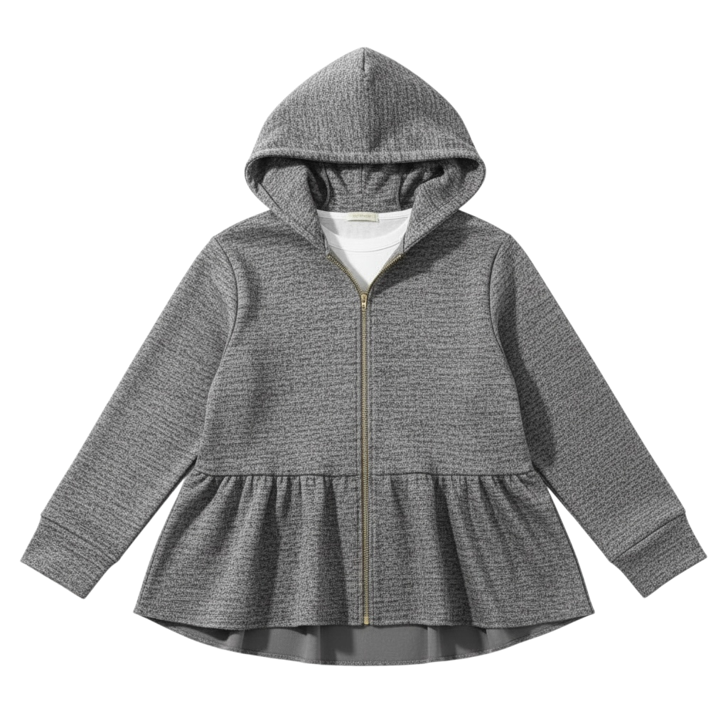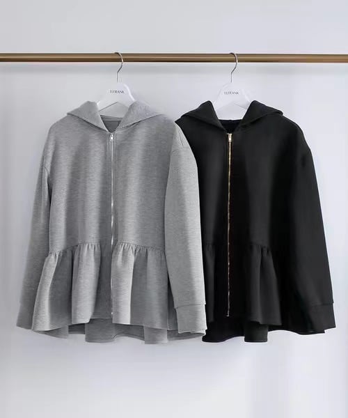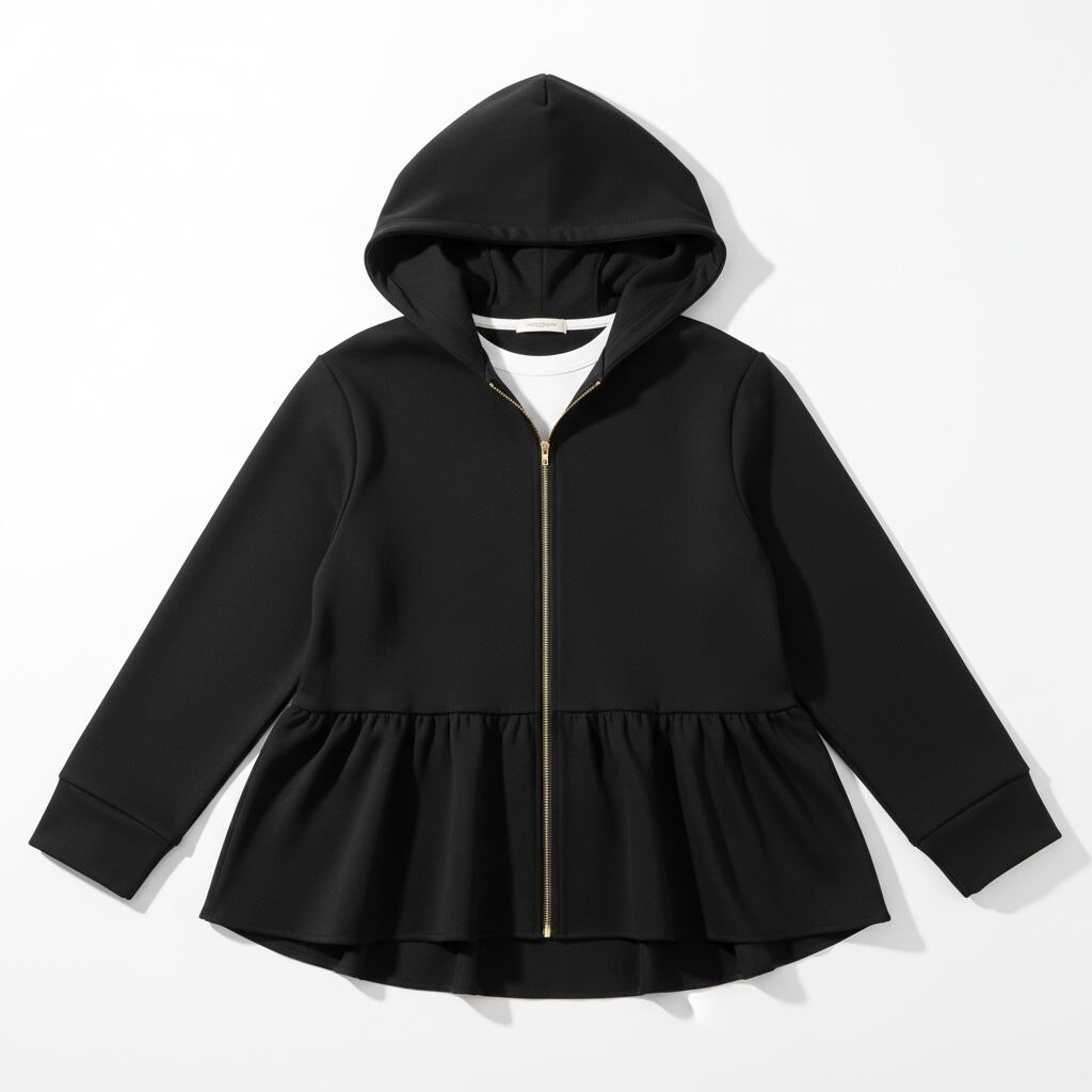 軽さと張りのあるダンボール素材を使用した、美しいペプラムシルエットが特徴的なパーカーです。カジュアルなパーカーを女性らしく着こなせる一着です。