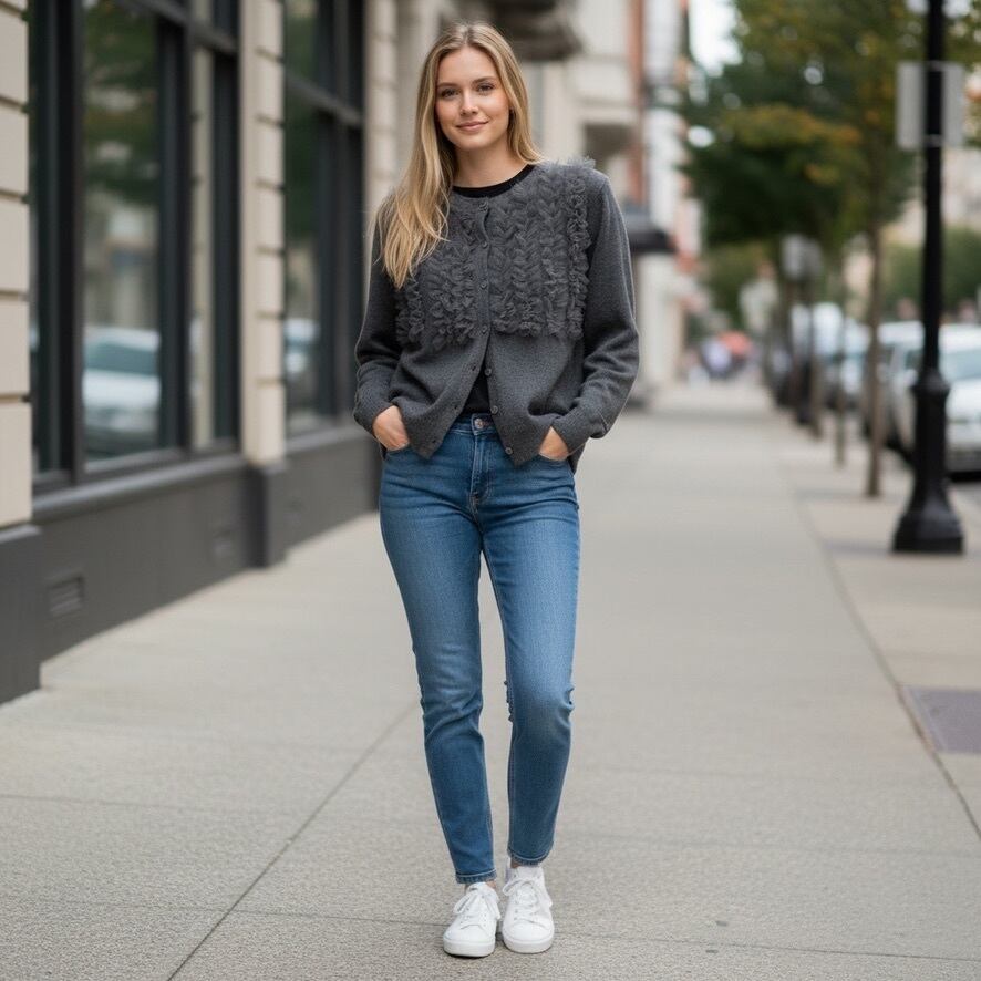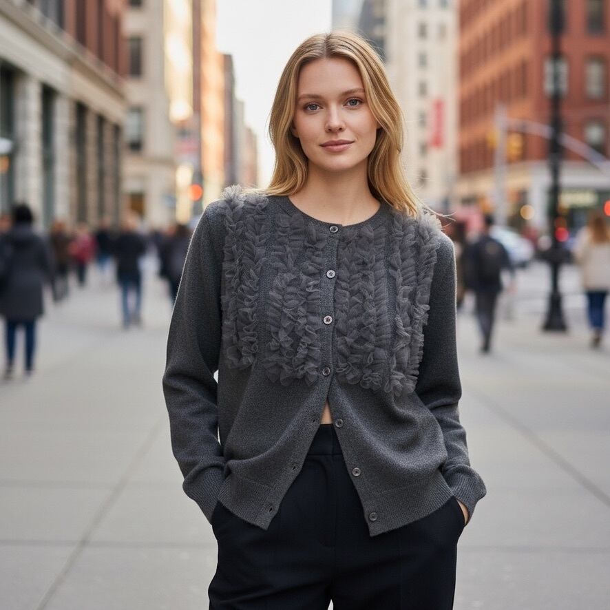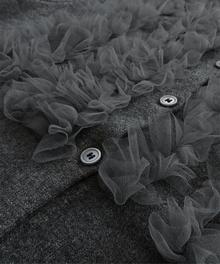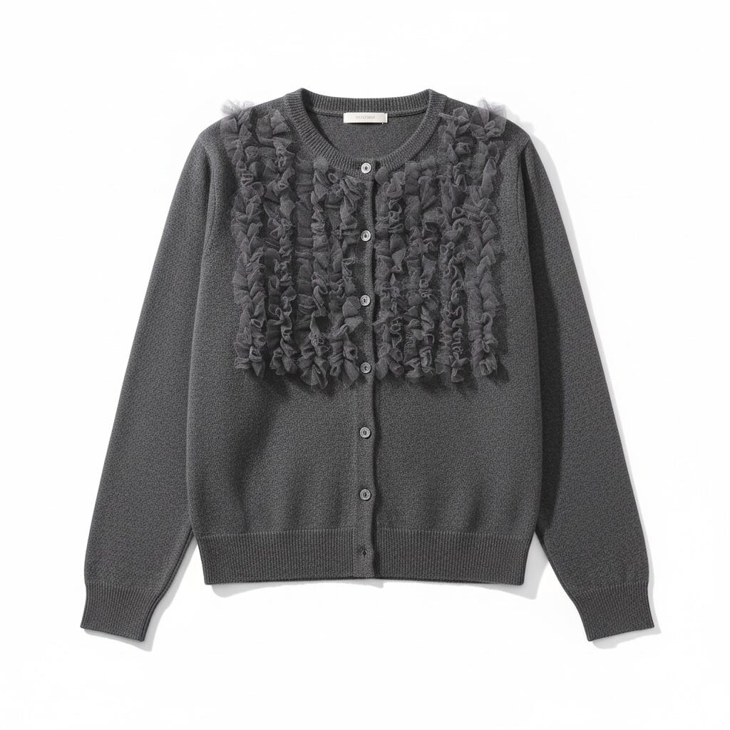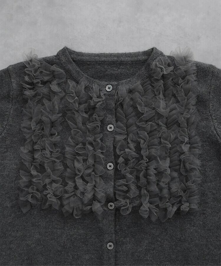 フェミニンなチュールフリルを大胆にあしらったカーディガンです。ベーシックなカラー展開なのでデイリーなカジュアルスタイルからオフィス、オケージョンパーティシーンまで幅広く活躍する一着です。