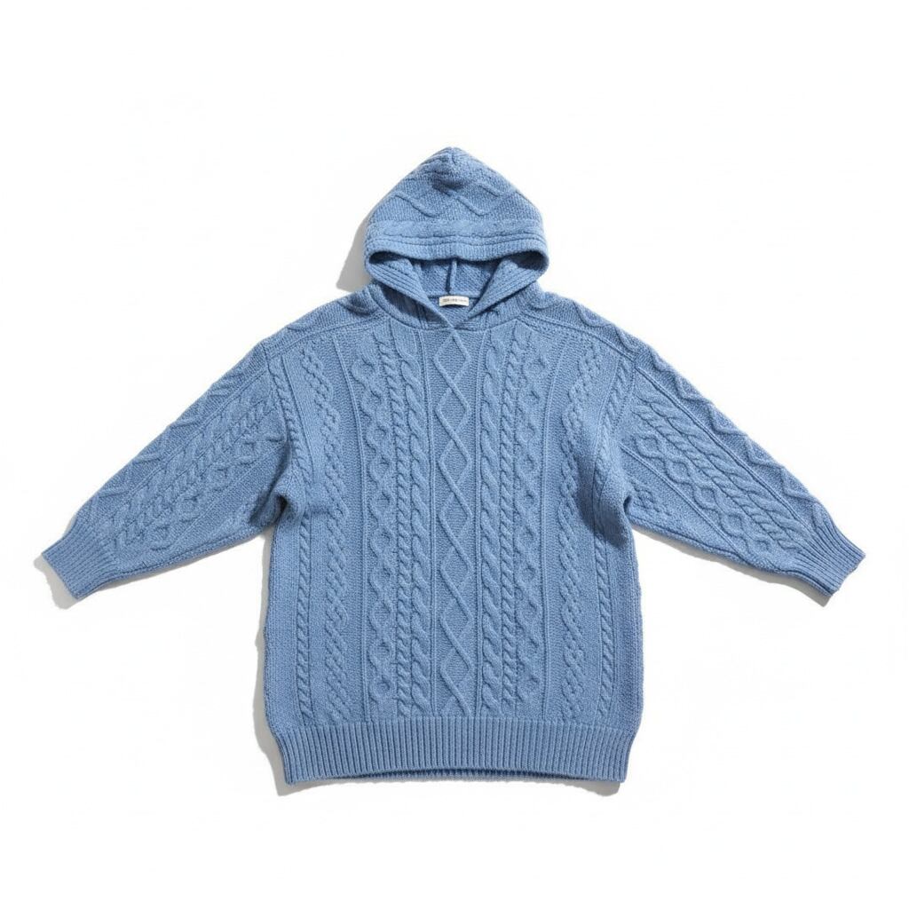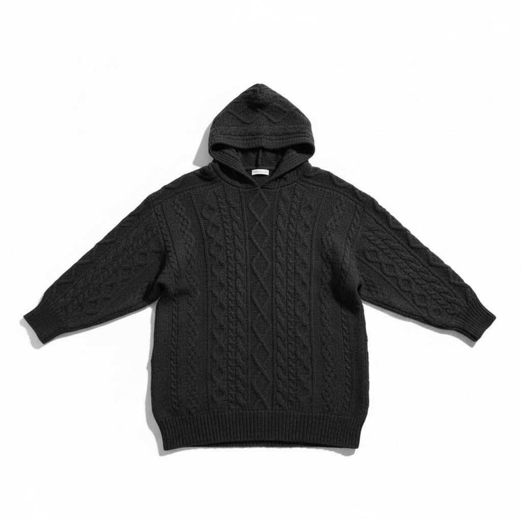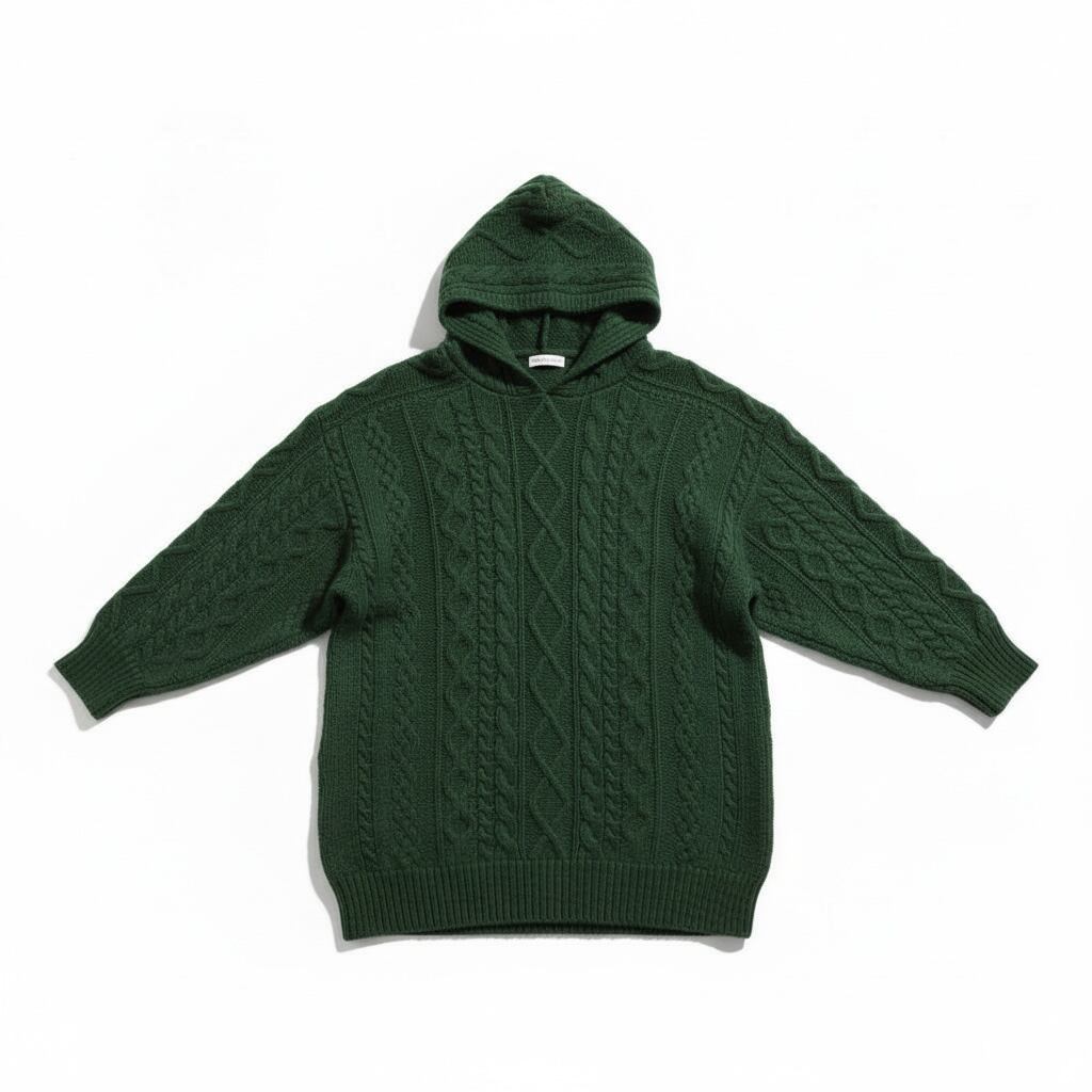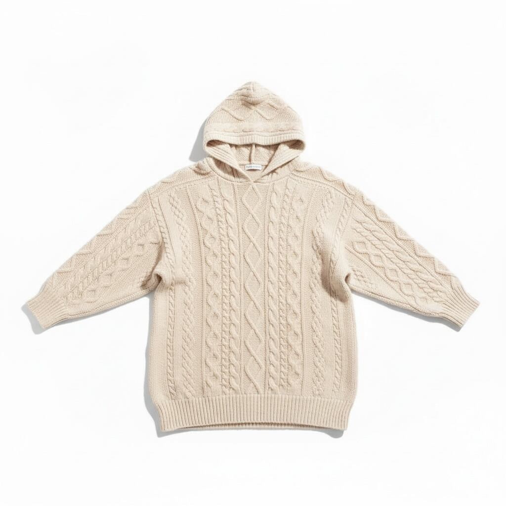 一枚でワンピースとしても着られるチュニックニットです。ケーブルニットとフード付きのパーカーデザインでカジュアルシーンにぴったりな一着です。