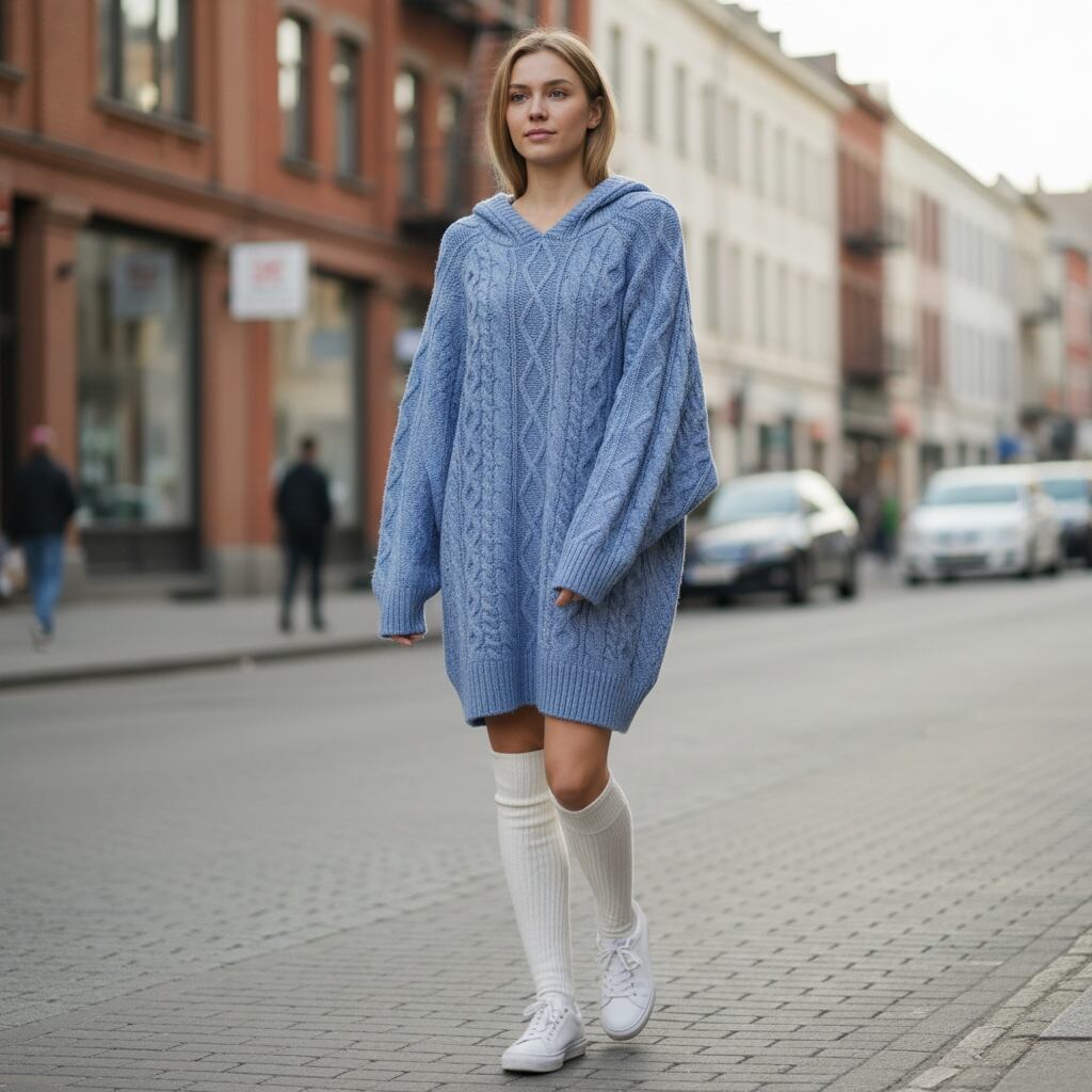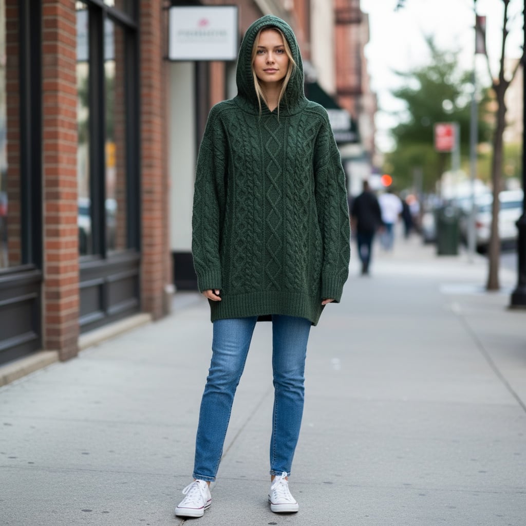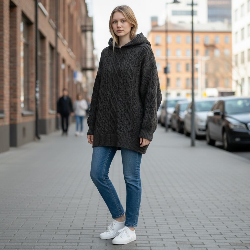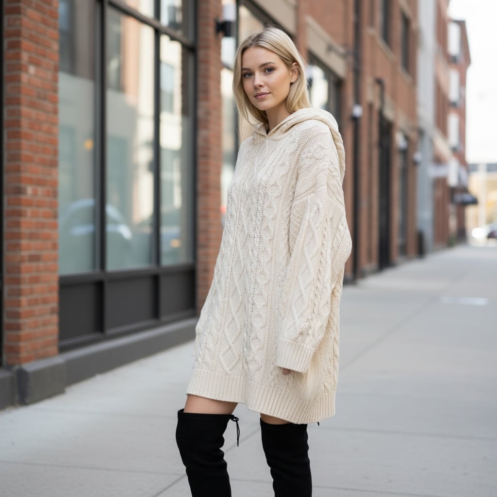 一枚でワンピースとしても着られるチュニックニットです。ケーブルニットとフード付きのパーカーデザインでカジュアルシーンにぴったりな一着です。