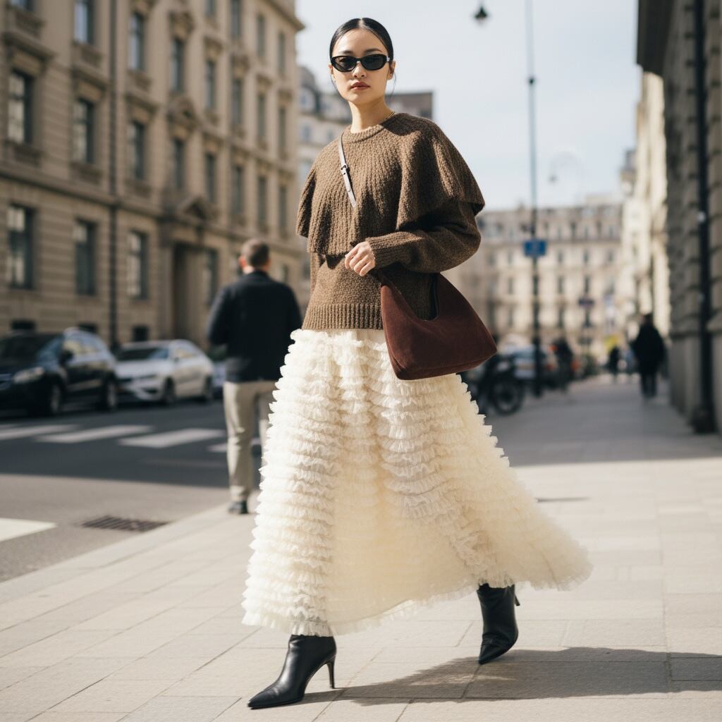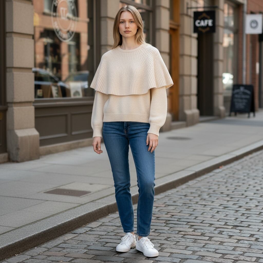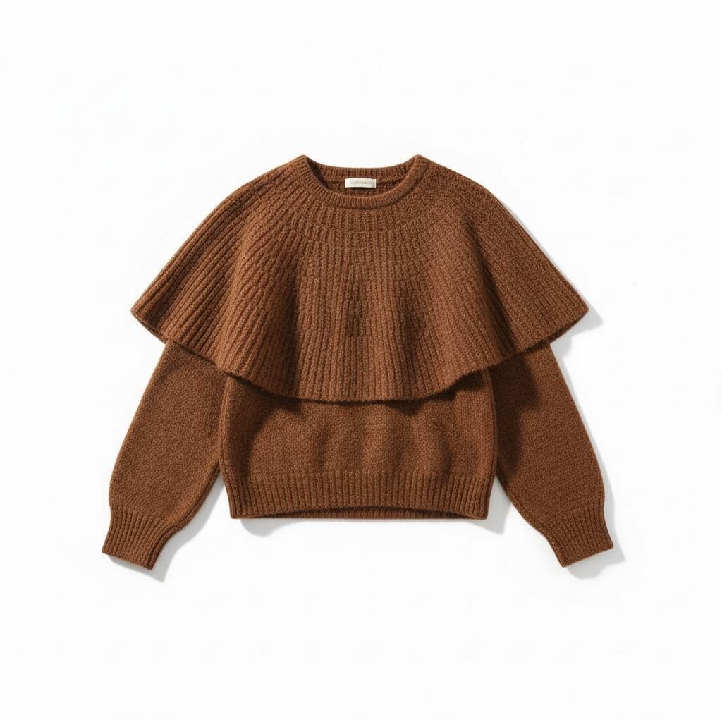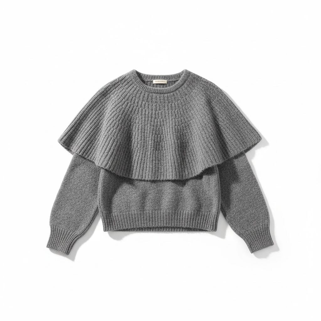 肩から胸元にかけてポンチョがドッキングしたデザインが新鮮なニットトップスです。一枚で存在感があり、スタイリングをモードな雰囲気に昇華してくれる一着です。