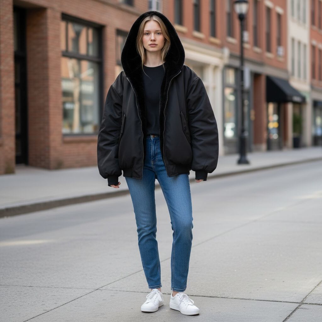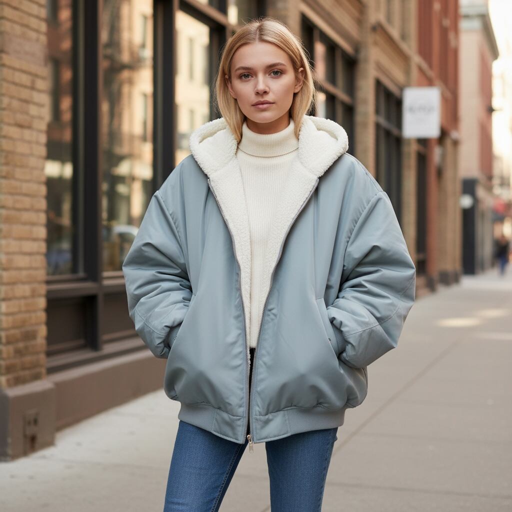 ファーと合繊素材のリバーシブルで着られるフーデッドブルゾンです。暖かいファーと撥水性・防風性の高い合繊素材のコンビネーションで防寒性も高く真冬でも着られる一着です。