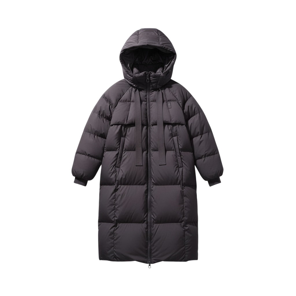 膝が隠れるロング丈でしっかりと防寒してくれるダウンコートです。顔周りをしっかり覆うスタンドフードなので防寒性の高い一着です。