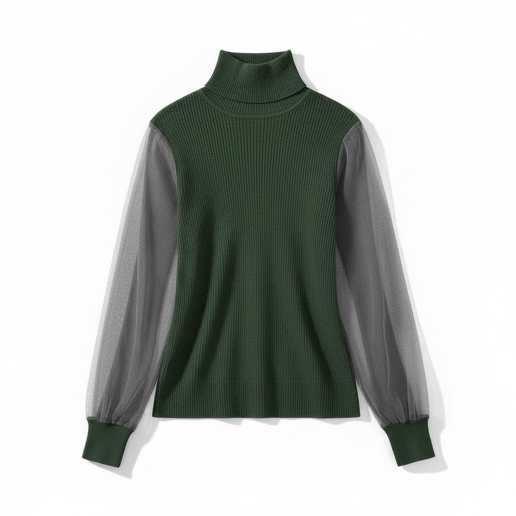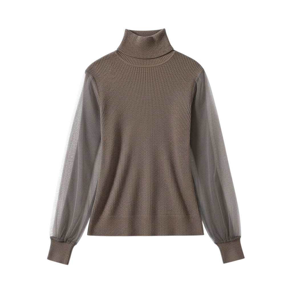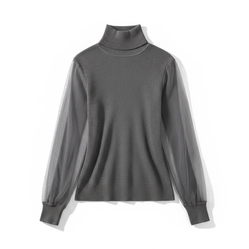 透け感のあるチュール袖が特徴のタートルニットです。インナータートルとしてはもちろん、コートを脱いだ時の華やかなデザインが周りと差をつける一着です。